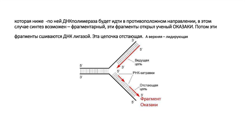 которая ниже -по ней ДНКполимераза будет идти в противоположном направлении, в этомслучае синтез возможен – фрагментарный, эти фрагменты открыл ученый ОКАЗАКИ. Потом эти