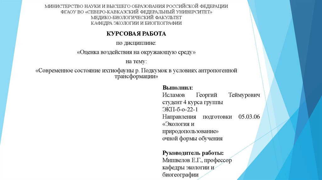 Предмет: Ихтиофауна р. Подкумок в условиях антропогенной