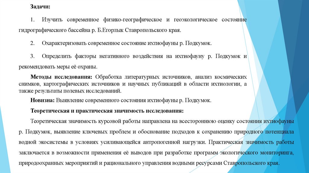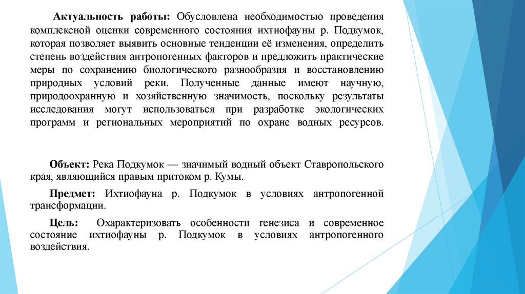 2. Актуальность работы: Обусловлена необходимостью проведения комплексной оценки современного состояния ихтиофауны р. Подкумок,