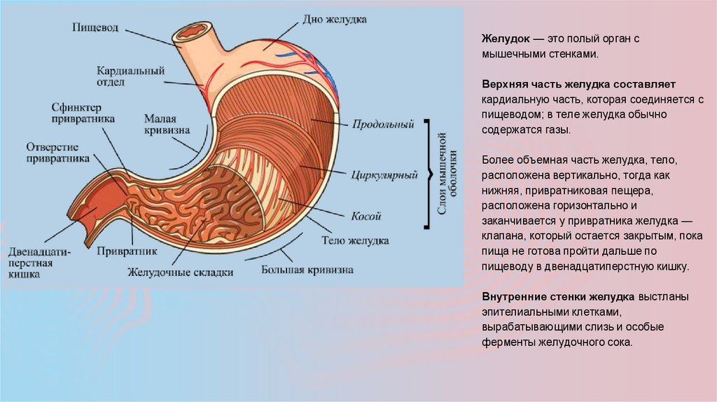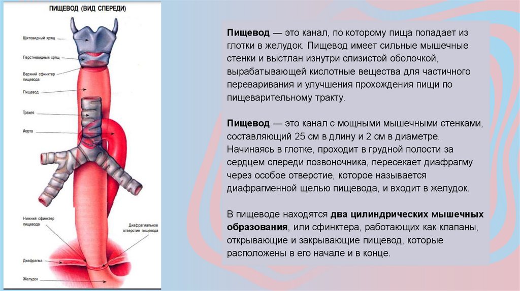 Пищевод — это канал, по которому пища попадает изглотки в желудок. Пищевод имеет сильные мышечные