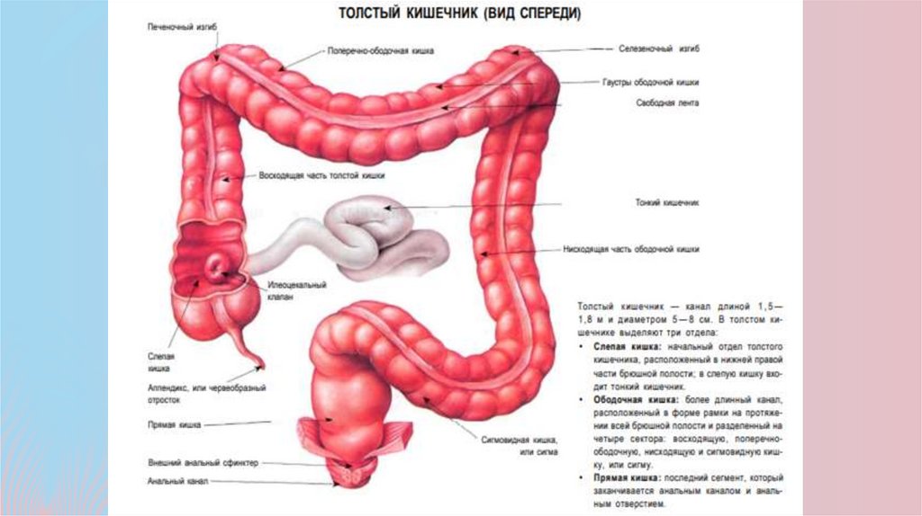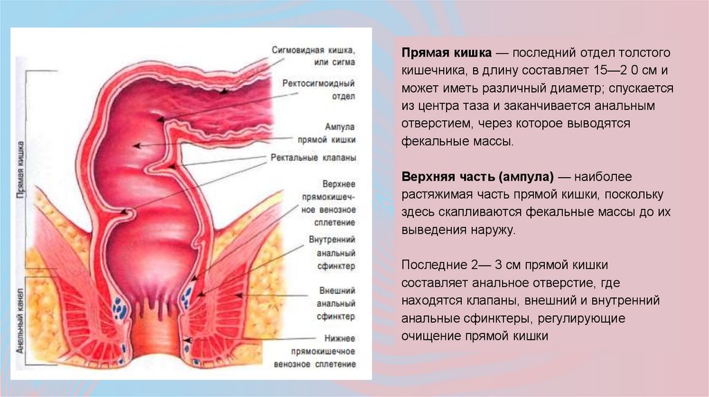 Прямая кишка — последний отдел толстогокишечника, в длину составляет 15—2 0 см и
