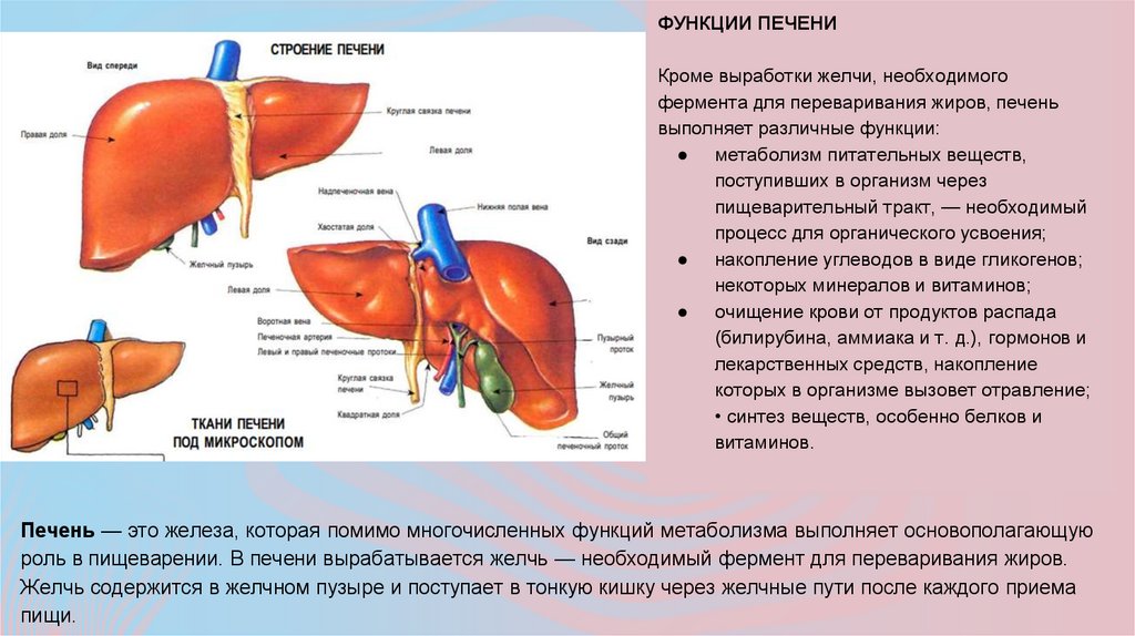 роль в пищеварении. В печени вырабатывается желчь — необходимый фермент для переваривания жиров.