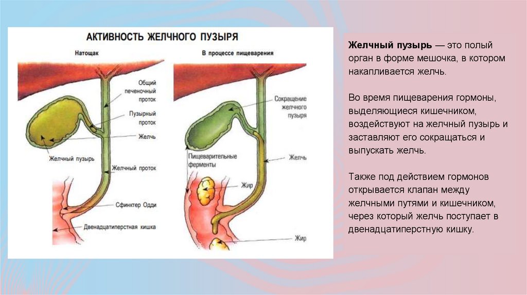 Желчь содержится в желчном пузыре и поступает в тонкую кишку через желчные пути после каждого приема