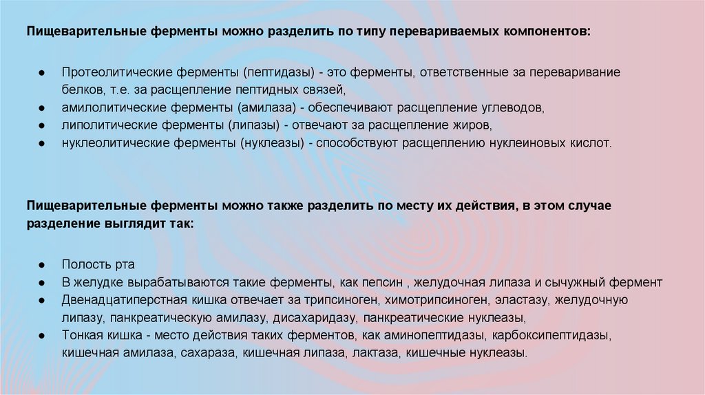 Пищеварительные ферменты можно разделить по типу перевариваемых компонентов:Протеолитические ферменты (пептидазы) - это ферменты, ответственные за переваривание