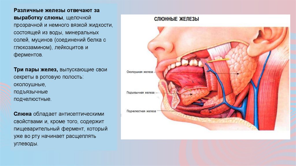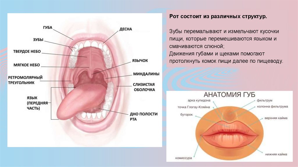 Рот состоит из различных структур.Зубы перемалывают и измельчают кусочки