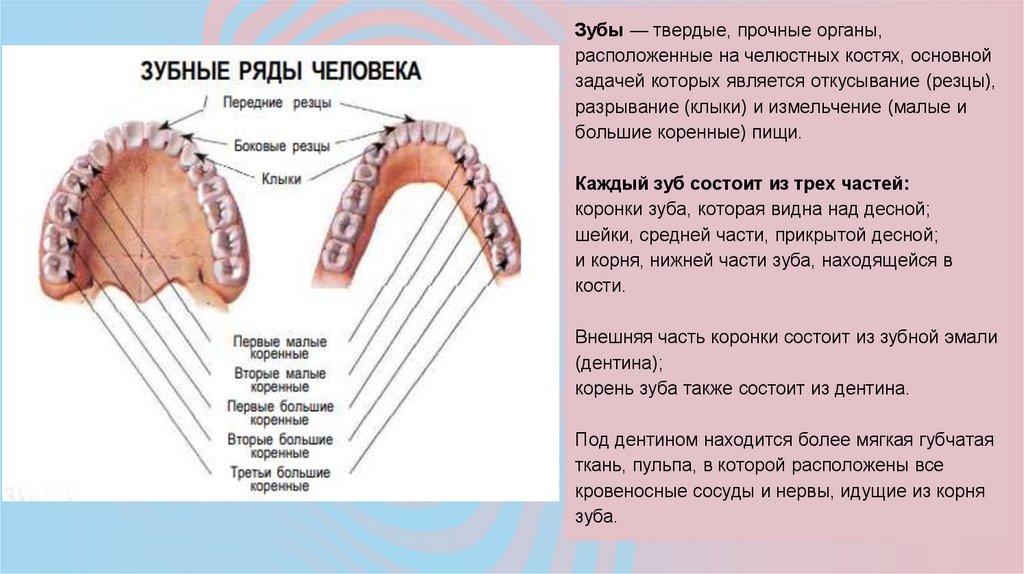 Зубы — твердые, прочные органы,расположенные на челюстных костях, основной