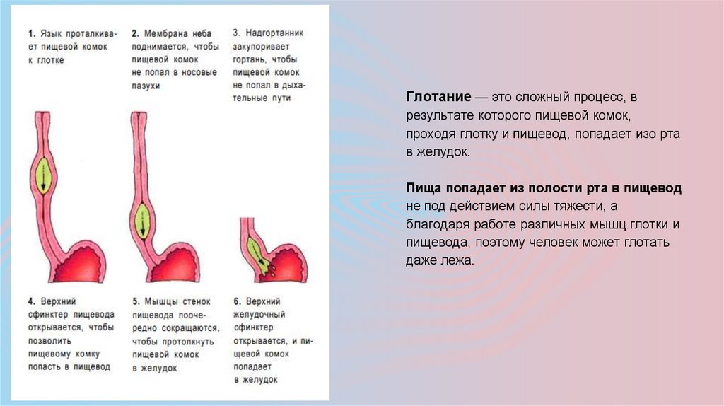 Глотание — это сложный процесс, врезультате которого пищевой комок,