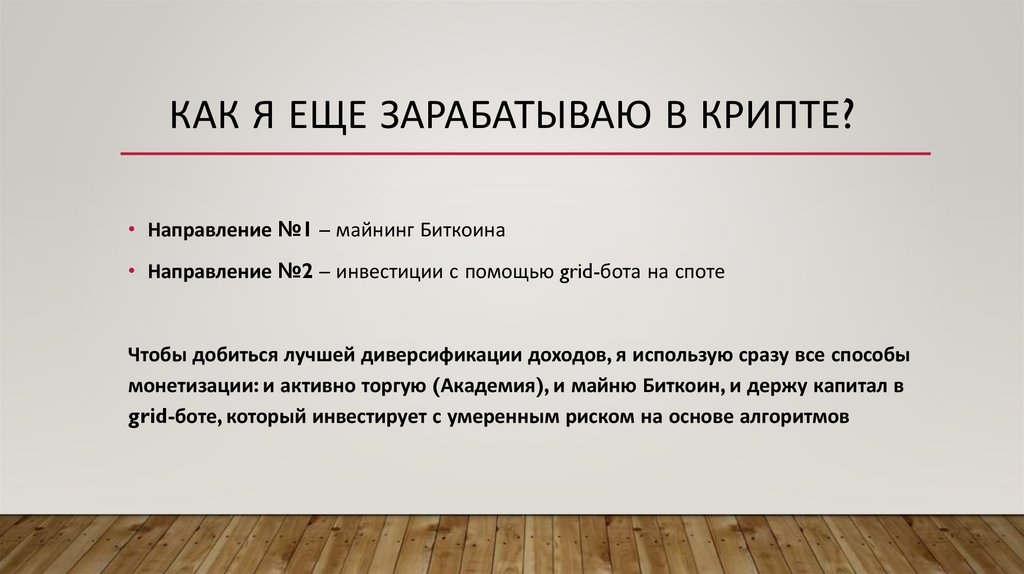 • Направление №1 – майнинг Биткоина• Направление №2 – инвестиции с помощью grid-бота на споте