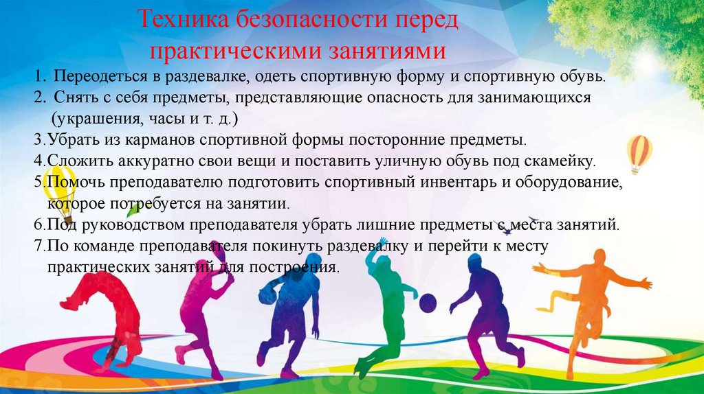 1. Переодеться в раздевалке, одеть спортивную форму и спортивную обувь.