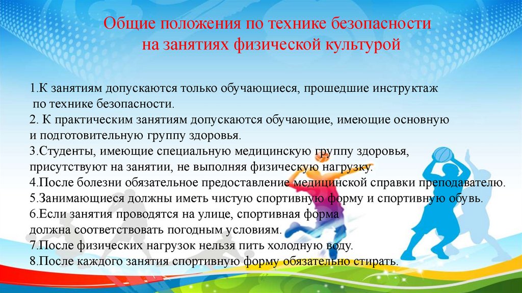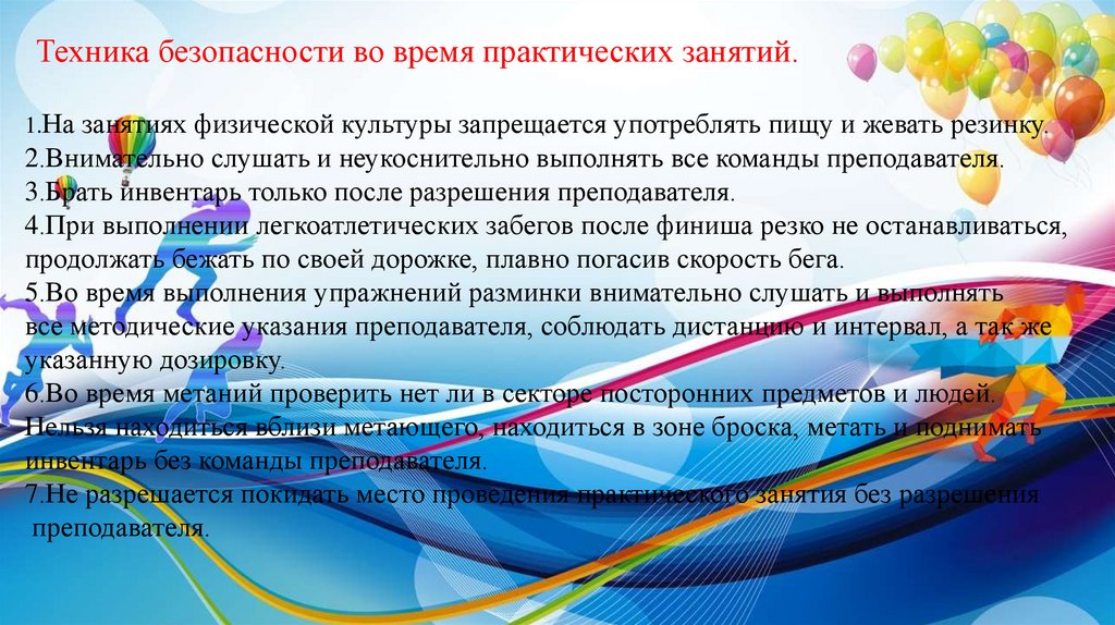 Техника безопасности во время практических занятий.1.На занятиях физической культуры запрещается употреблять пищу и жевать резинку.
