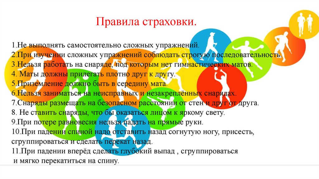 Правила страховки.1.Не выполнять самостоятельно сложных упражнений.