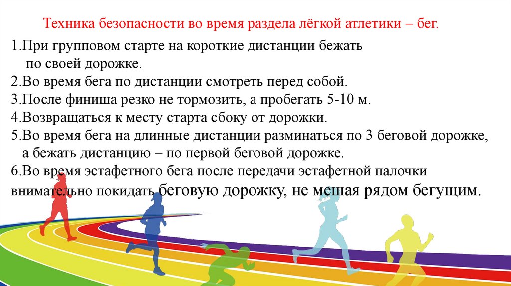 Техника безопасности во время раздела лёгкой атлетики – бег.1.При групповом старте на короткие дистанции бежать