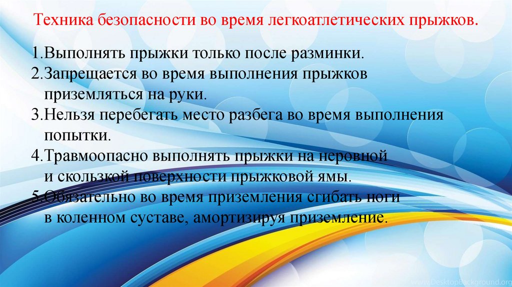 Техника безопасности во время легкоатлетических прыжков.1.Выполнять прыжки только после разминки.