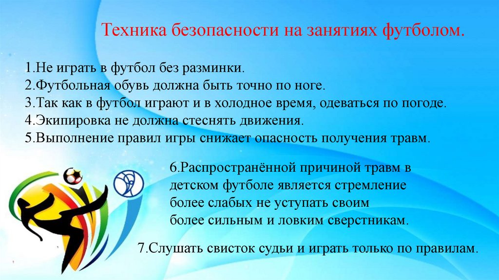 Техника безопасности на занятиях футболом.1.Не играть в футбол без разминки.