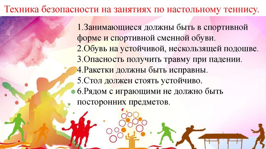 Техника безопасности на занятиях по настольному теннису.1.Занимающиеся должны быть в спортивной