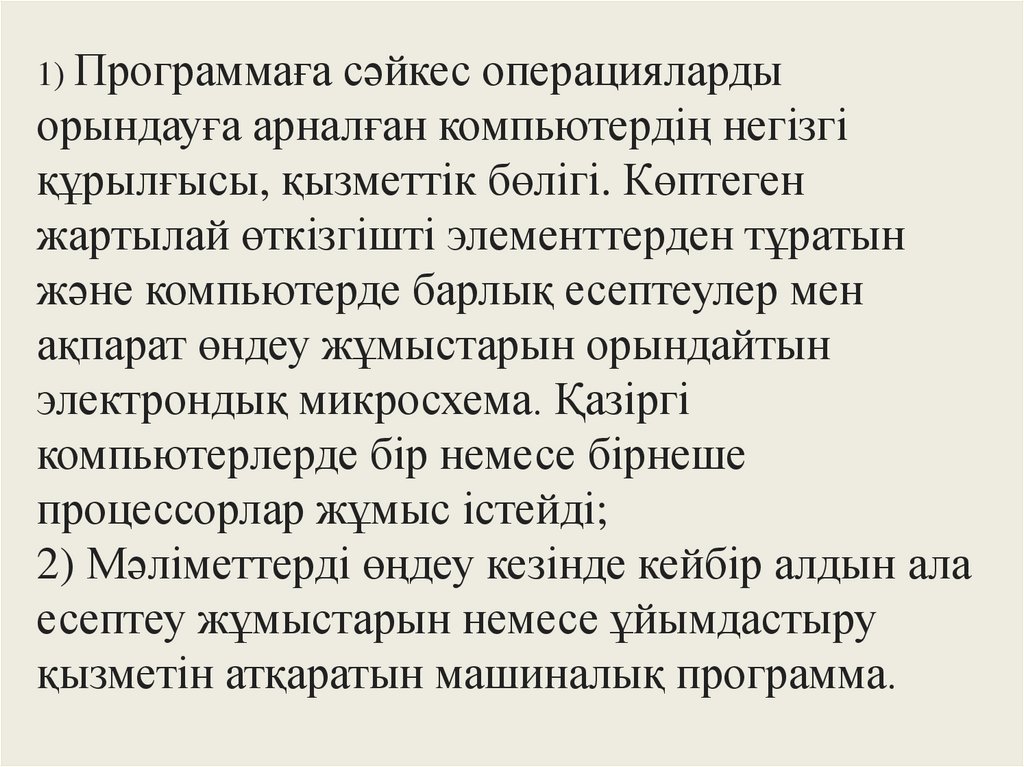 1) Программаға сәйкес операциялардыорындауға арналған компьютердің негізгі