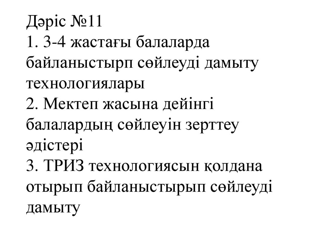 1. Дәріс №11 1. 3-4 жастағы балаларда байланыстырп сөйлеуді дамыту технологиялары 2. Мектеп жасына дейінгі балалардың сөйлеуін