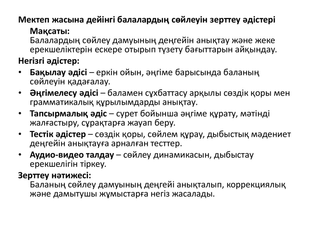 Баланың сөйлеу дамуының деңгейі анықталып, коррекциялық