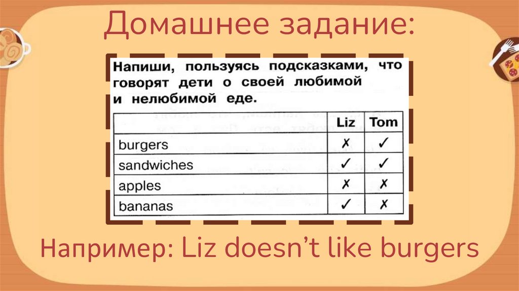 Домашнее задание:Например: Liz doesn’t like burgers