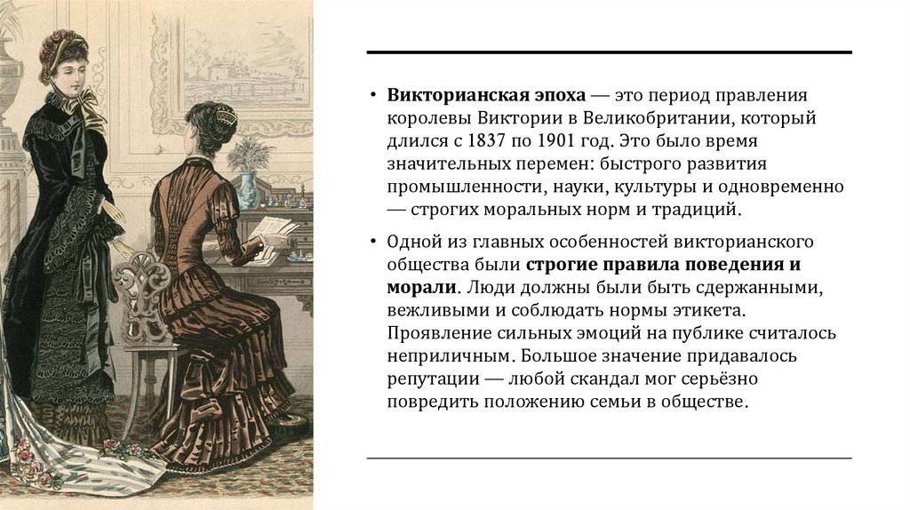 • Викторианская эпоха — это период правлениякоролевы Виктории в Великобритании, который