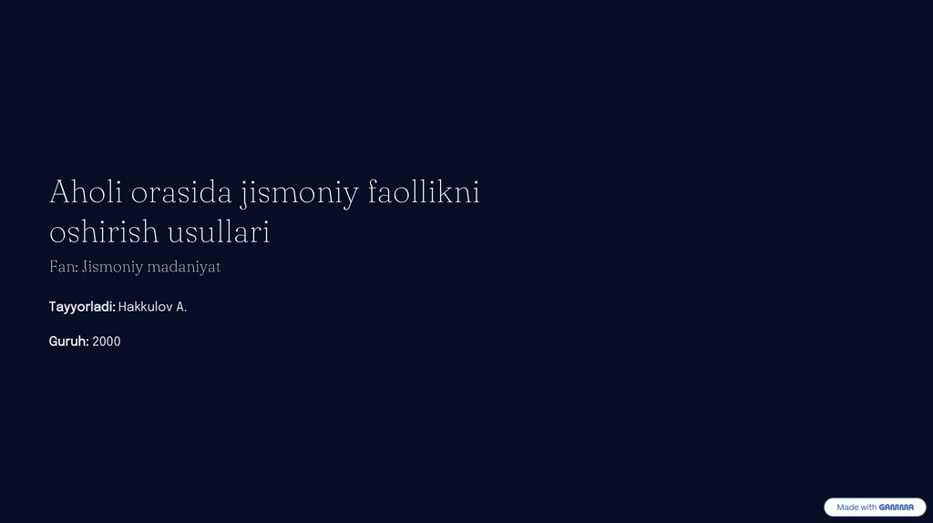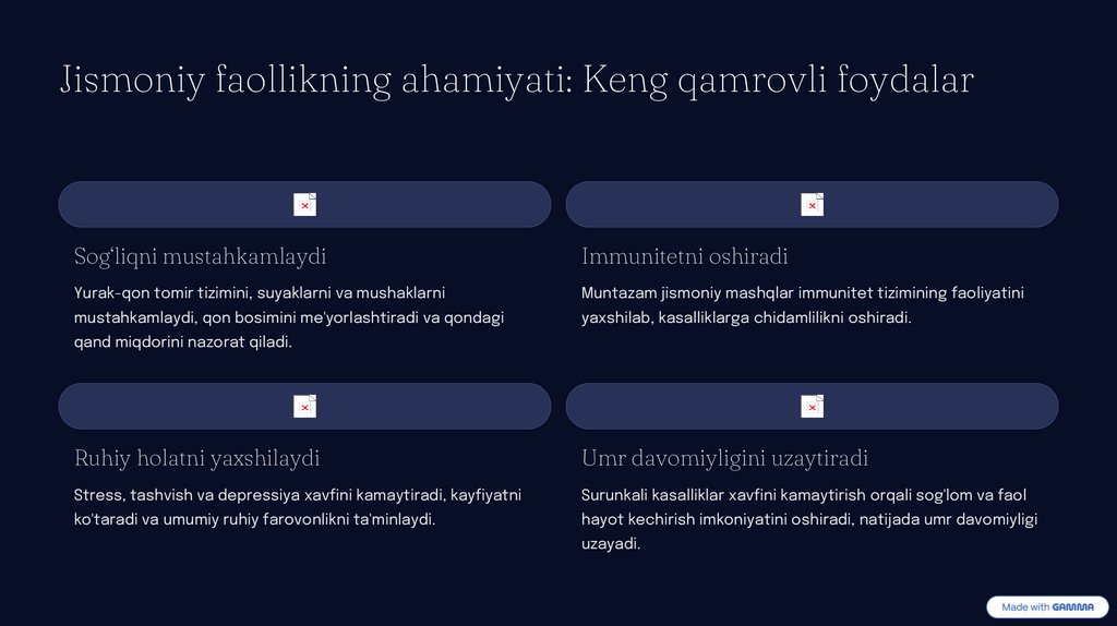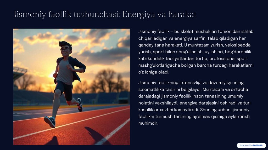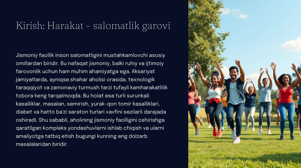 Kirish: Harakat – salomatlik garoviJismoniy faollik inson salomatligini mustahkamlovchi asosiy