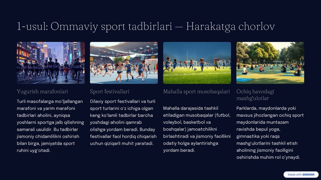 1-usul: Ommaviy sport tadbirlari — Harakatga chorlovMahalla sport musobaqalari