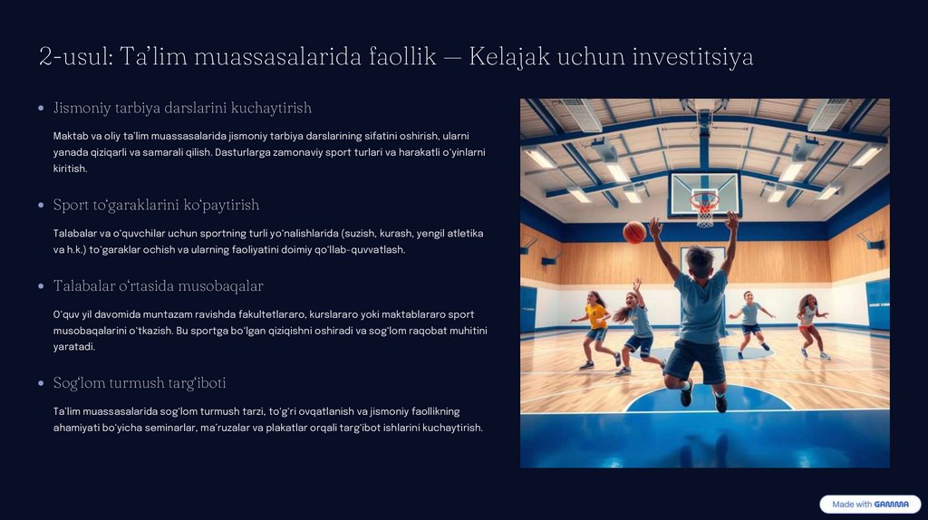 2-usul: Ta’lim muassasalarida faollik — Kelajak uchun investitsiyaJismoniy tarbiya darslarini kuchaytirish