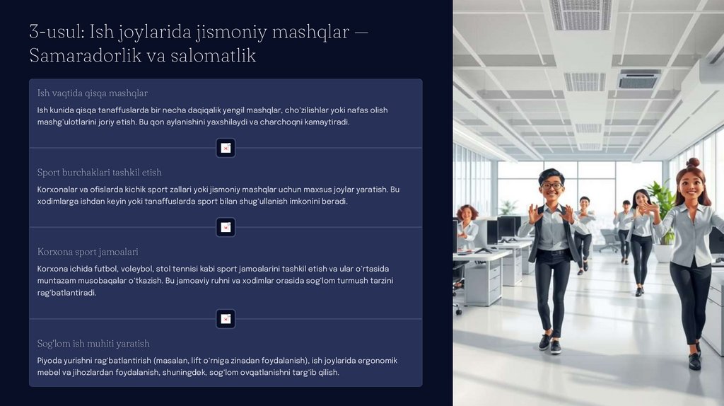 3-usul: Ish joylarida jismoniy mashqlar —Samaradorlik va salomatlik