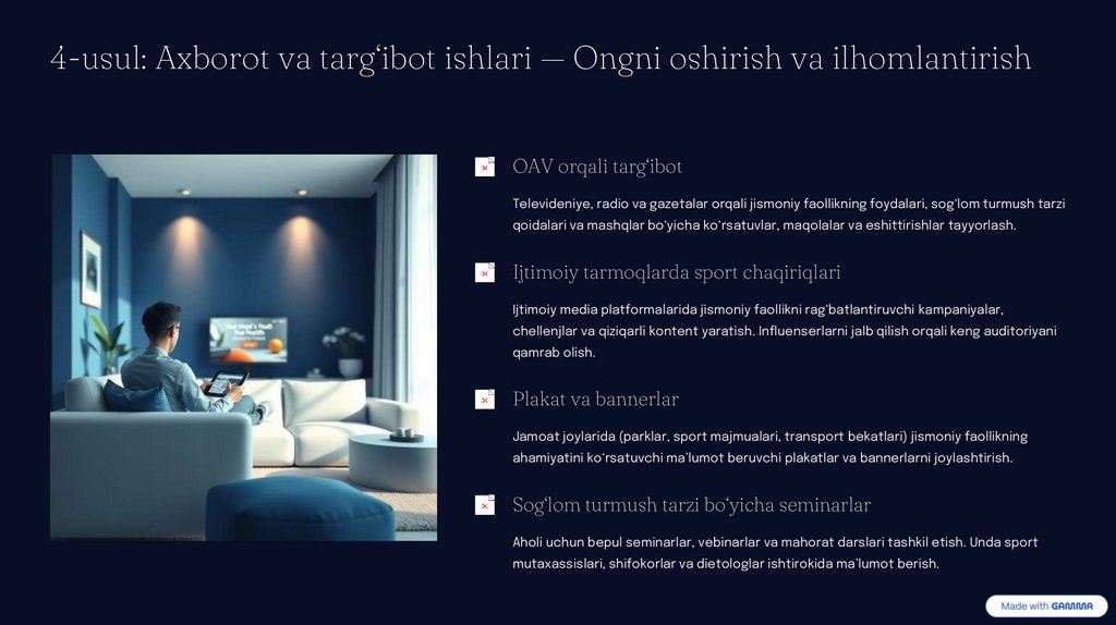 4-usul: Axborot va targ‘ibot ishlari — Ongni oshirish va ilhomlantirishOAV orqali targ‘ibot