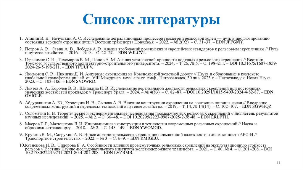 7. Соломатин Е. В. Теоретические и экспериментальные исследования промежуточных рельсовых скреплений // Бюллетень результатов