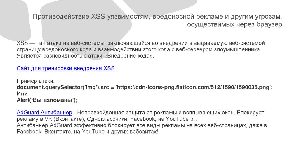 Противодействие XSS-уязвимостям, вредоносной рекламе и другим угрозам,осуществимых через браузер