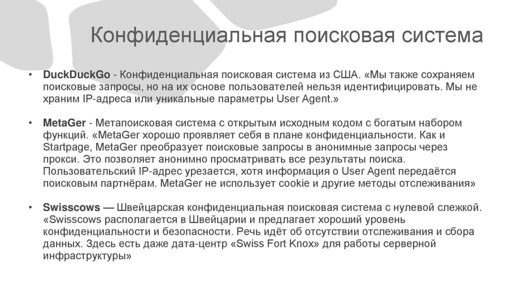 Конфиденциальная поисковая система• DuckDuckGo - Конфиденциальная поисковая система из США. «Мы также сохраняем
