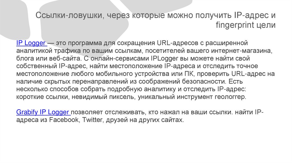 геолокации, но есть сервисы, которые позволяют создателю ссылки получить даже IPадреса переходивших по ней.
