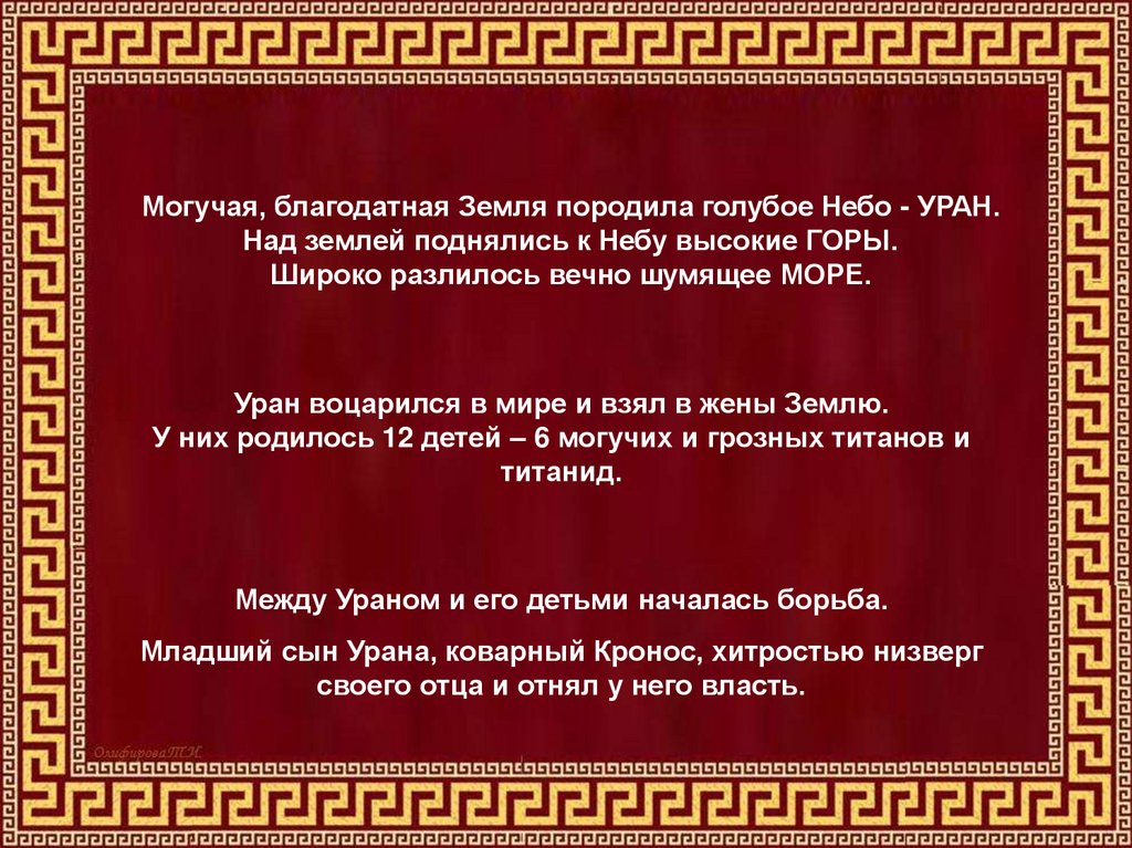 Могучая, благодатная Земля породила голубое Небо - УРАН.Над землей поднялись к Небу высокие ГОРЫ.