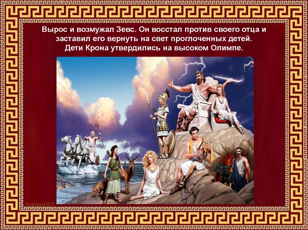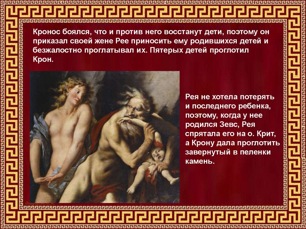 Кронос боялся, что и против него восстанут дети, поэтому онприказал своей жене Рее приносить ему родившихся детей и