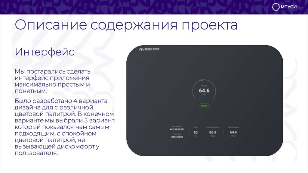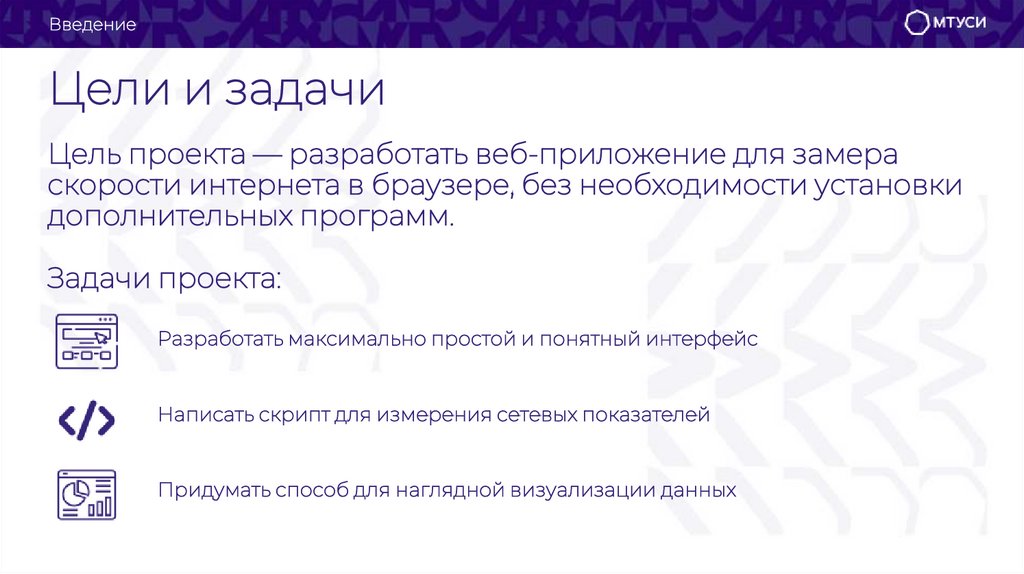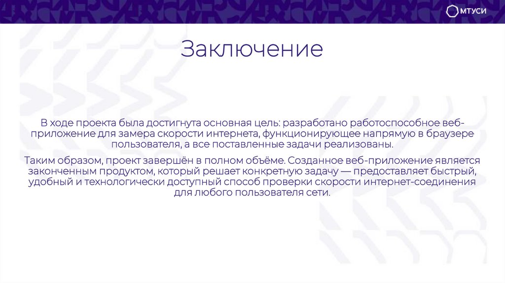 В ходе проекта была достигнута основная цель: разработано работоспособное вебприложение для замера скорости интернета, функционирующее напрямую в браузерепользователя, а все поставленные задачи реализованы.