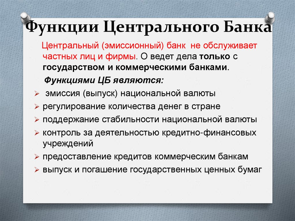 Центральный (эмиссионный) банк не обслуживаетчастных лиц и фирмы. О ведет дела только с