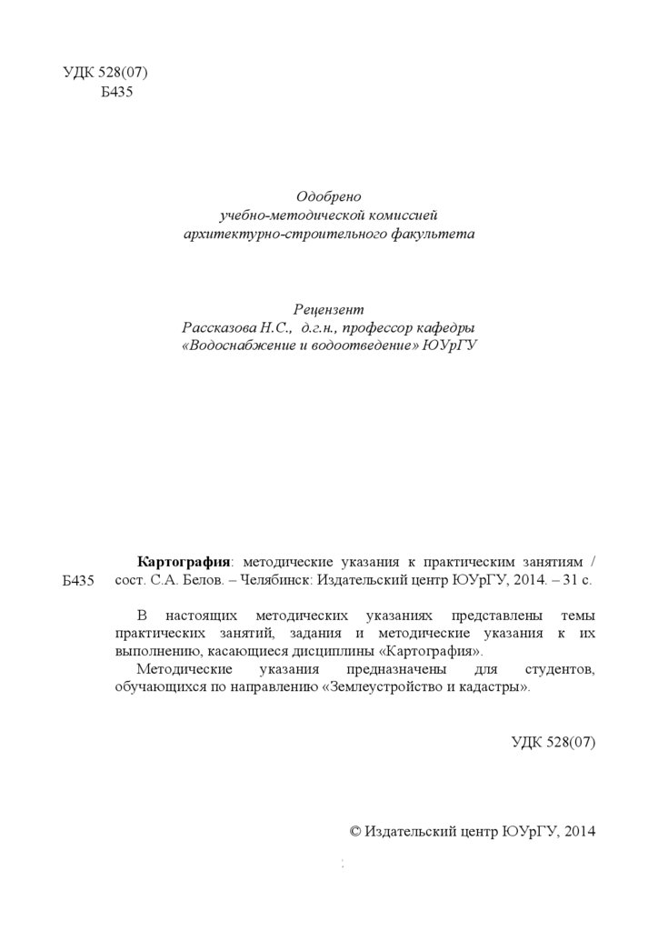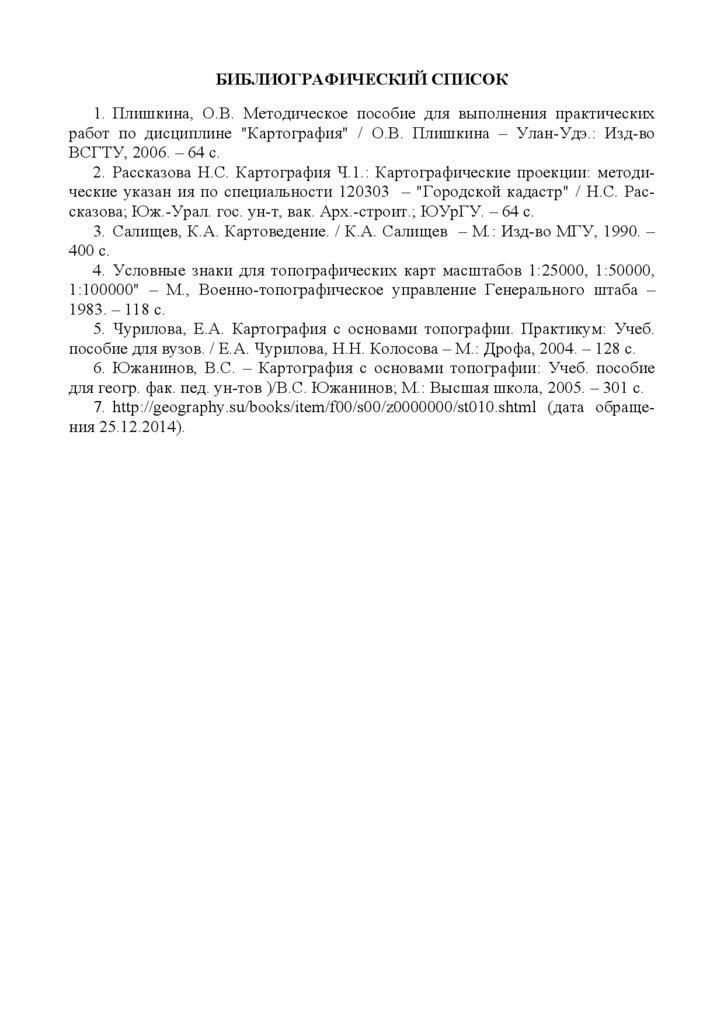 2. Рассказова Н.С. Картография Ч.1.: Картографические проекции: методические указан ия по специальности 120303 – "Городской кадастр" / Н.С. Рассказова; Юж.-Урал. гос. ун-т, вак. Арх.-строит.; ЮУрГУ. – 64 с.
