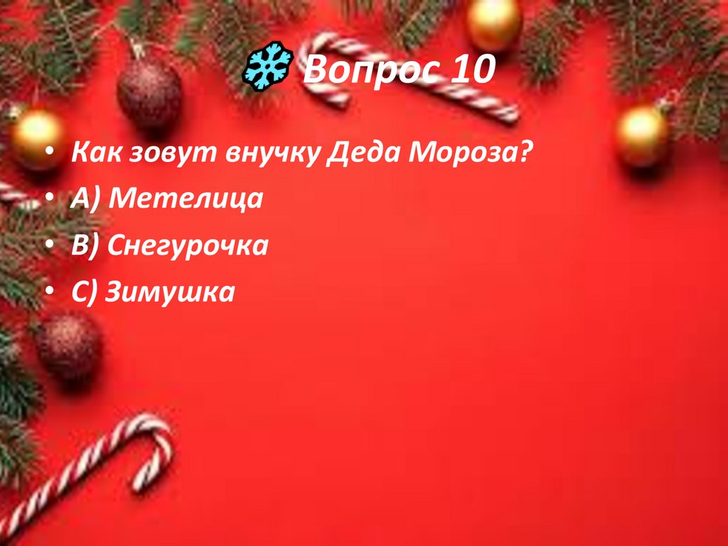Вопрос 10• Как зовут внучку Деда Мороза?