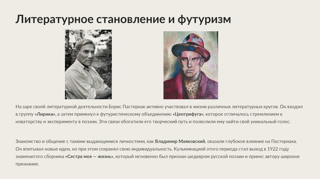 Литературное становление и футуризмНа заре своей литературной деятельности Борис Пастернак активно участвовал в жизни различных литературных кругов. Он входил