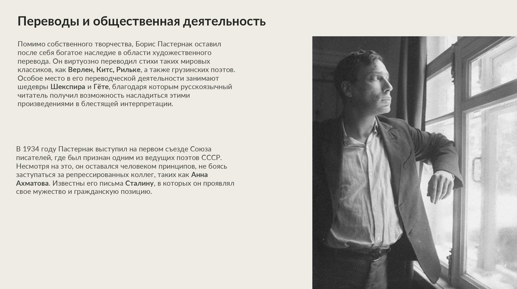 Переводы и общественная деятельностьПомимо собственного творчества, Борис Пастернак оставил