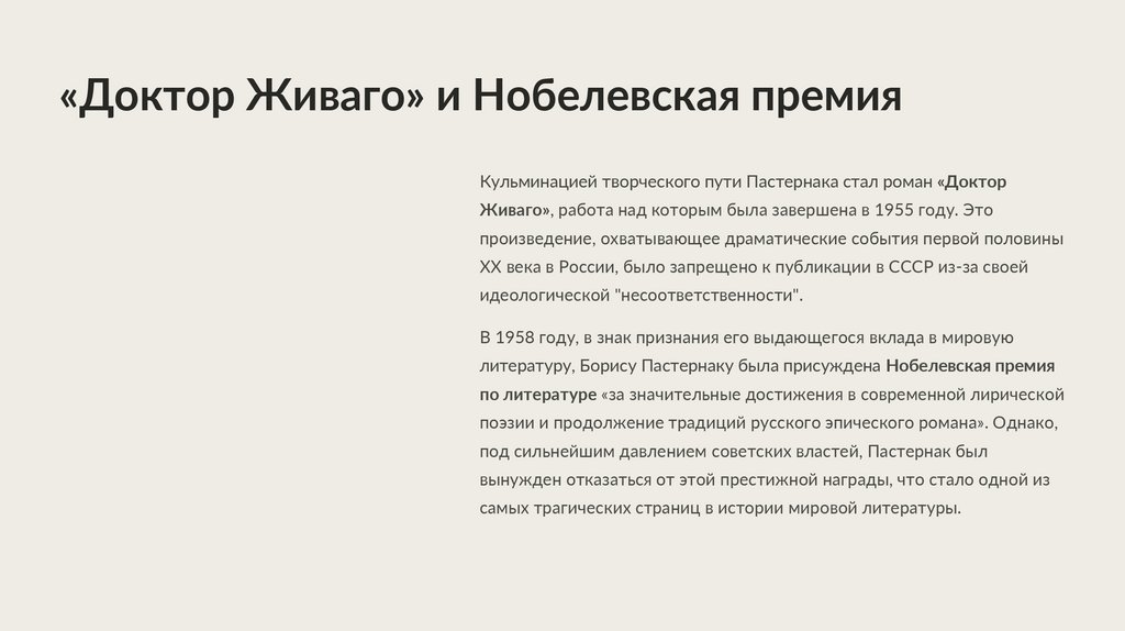«Доктор Живаго» и Нобелевская премияКульминацией творческого пути Пастернака стал роман «Доктор