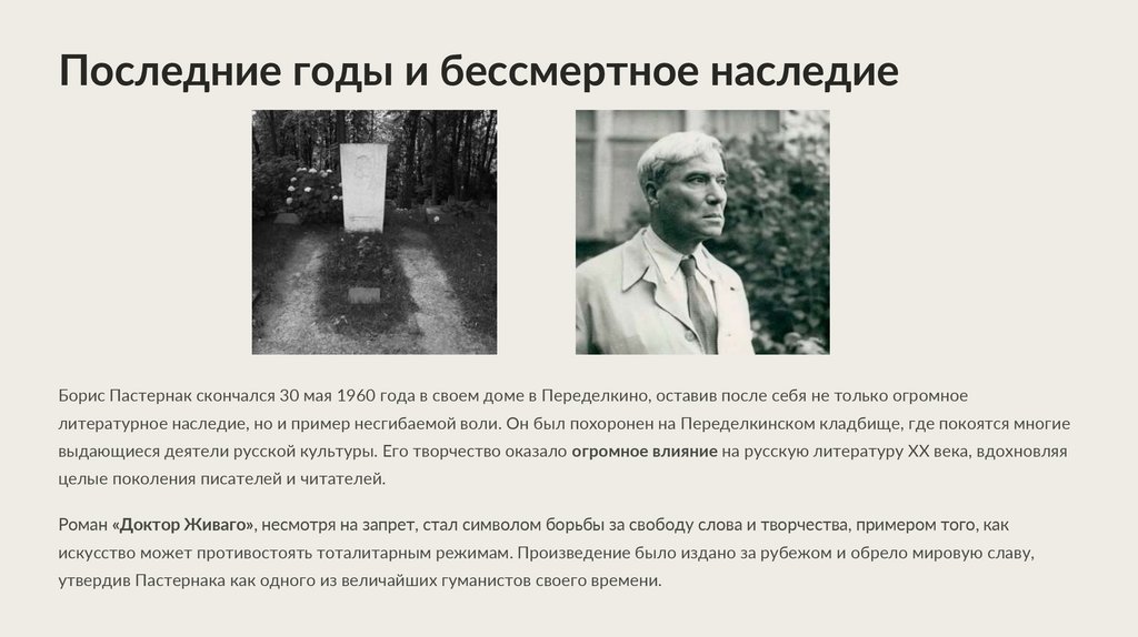 Последние годы и бессмертное наследиеБорис Пастернак скончался 30 мая 1960 года в своем доме в Переделкино, оставив после себя не только огромное