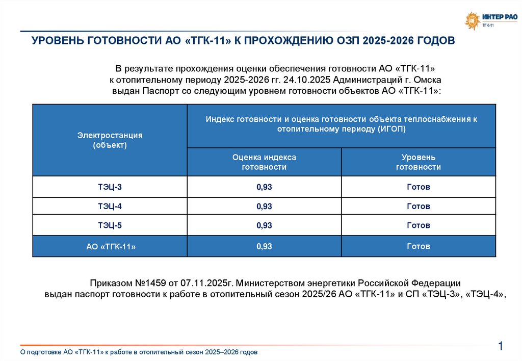 УРОВЕНЬ ГОТОВНОСТИ АО «ТГК-11» К ПРОХОЖДЕНИЮ ОЗП 2025-2026 ГОДОВВ результате прохождения оценки обеспечения готовности АО «ТГК-11»