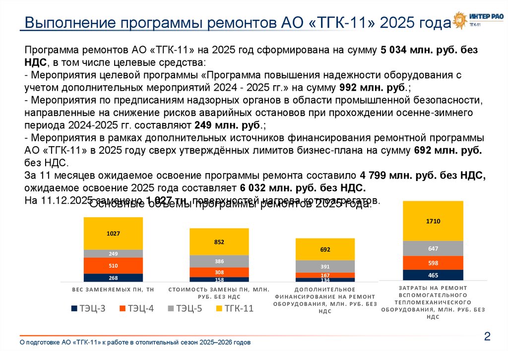 Выполнение программы ремонтов АО «ТГК-11» 2025 годаПрограмма ремонтов АО «ТГК-11» на 2025 год сформирована на сумму 5 034 млн. руб. без