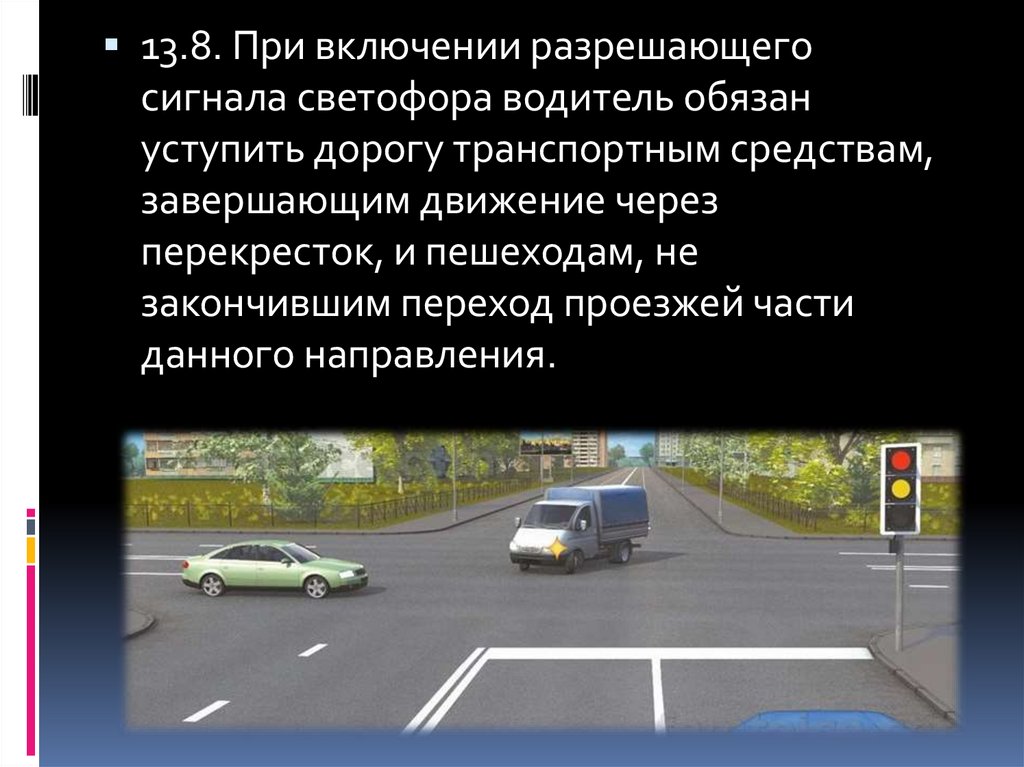 13.8. При включении разрешающегосигнала светофора водитель обязан
