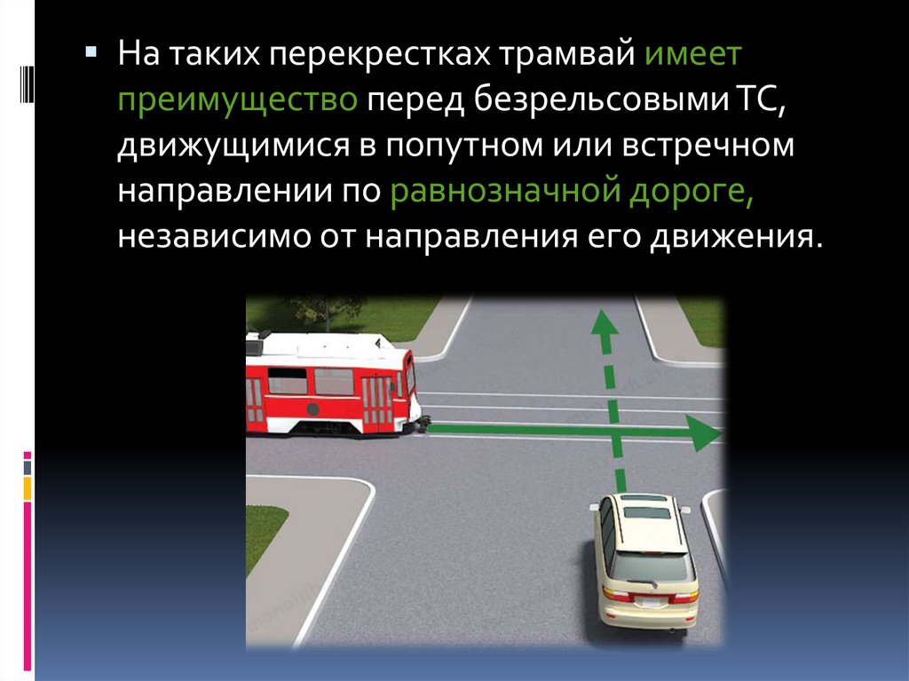 На таких перекрестках трамвай имеетпреимущество перед безрельсовыми ТС,
