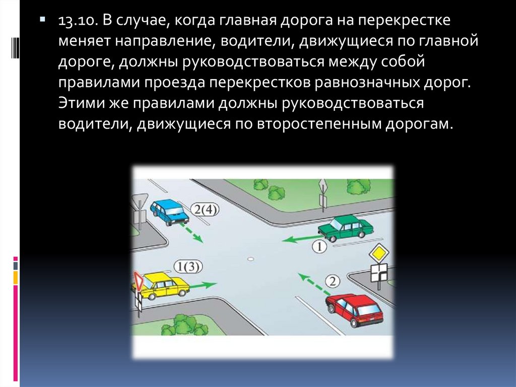 13.10. В случае, когда главная дорога на перекресткеменяет направление, водители, движущиеся по главной