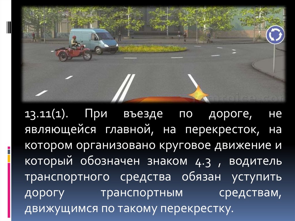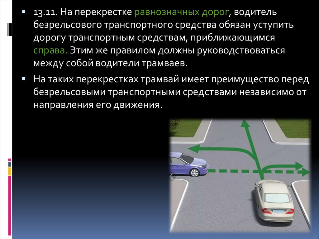 13.11. На перекрестке равнозначных дорог, водительбезрельсового транспортного средства обязан уступить