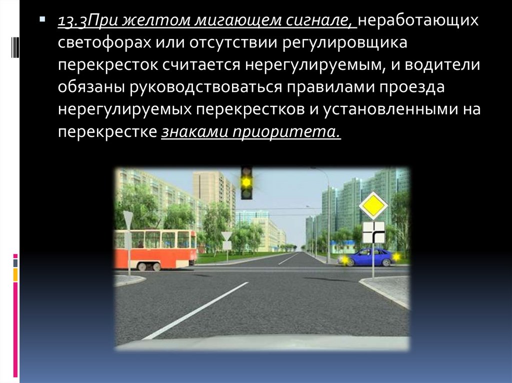 13.3При желтом мигающем сигнале, неработающихсветофорах или отсутствии регулировщика
